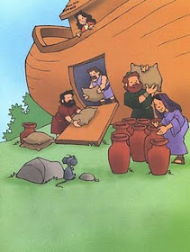 Quando tudo estava pronto, Noé entrou no barco com sua família e os animais que Deus havia enviado. Daí um anjo trancou a porta do lado de fora e ninguém podia mais entrar ou sair. Então começou a chover, mas as pessoas estavam tão ocupadas sendo más, que quando perceberam a água já ia até a canela. Era tarde demais. Choveu por 40 dias e 40 noites e tudo que estava na terra morreu ( Você pode aproveitar este momento e abusar dos efeitos especiais. Uma folha plastificada da pra fazer barulho de trovão. Da também pra usar um spray de água. As crianças vão amar). Deus castigou todos os seres vivos por causa da maldade. Depois de um tempo,  a chuva parou. Deus mandou um vento bem forte e as águas começaram a baixar. O barco então parou em cima de um dos montes de Ararate. Noé esperou alguns dias, abriu a janela do barco e soltou um corvo que ia e voltava até as águas baixarem. Depois ele soltou uma pombinha que foi e voltou porque não achou lugar pra pousar. Pela segunda vez, ele soltou a pombinha de novo e ela voltou com um raminho de oliveira no bico. Pela terceira vez Noé, soltou a pombinha e ela não voltou mais. Daí ele soube que estava na hora de sair. Noé então saiu com a família e os animais de dentro do barco. Ele fez um sacrifício pro Senhor com um casal de cada animal puro. Deus ficou com tão feliz com o sacrifício de gratidão de Noé que prometeu que nunca mais mandaria outro Dilúvio. E como prova, toda vez que chovesse, Deus mandaria um arco íris  no céu. Seria um aliança, um acordo entre Deus e o homem.  E esse acordo dura até hoje. Mas um dia, todas os seres vivos serão julgados cada um de acordo com suas ações. Se foram bons ou maus e Jesus que um dia sofreu o castigo do pecado por nós, será o grande Juíz, que julgará a todos.