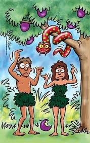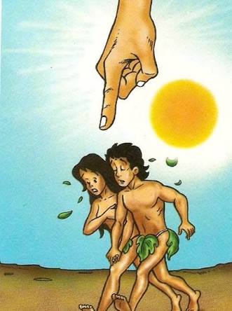 De repente, os dois se olharam e perceberam que estavam nus. A inocência deles havia ido embora. Eles ficaram com vergonha e pegaram folhas de figueira pra se cobrir. Como se assim, tudo fosse ficar resolvido. Imagina se roupa de folhas de árvores servem pra vestir? É claro que não.
